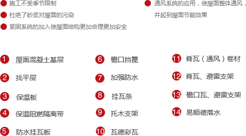 借鑒歐洲坡屋面防水理念,將平面防水改為立體防水,采用新型防水板材料,將材料防水和構造防水于一身,配合屋面系統組件,實現全天候全干作業。節省了屋面各類保護層次,打破了屋面冬季及雨后陰濕無法施工的常規,縮短了工期,提升系統安全性能。